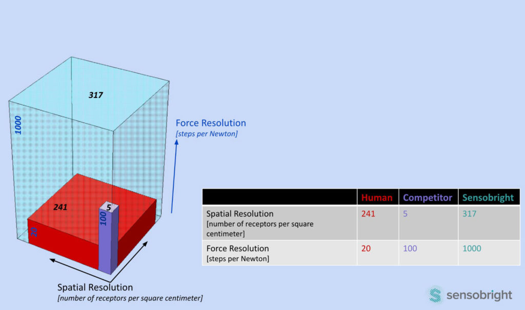 There are 241 nerve endings per square centimeter (cm2) on the human fingertip which transmit impulses to the brain without any loss. Our technology allows for 242 receptors which is greater than that of a fingertip. Prior to our technology robots and other devices could only achieve a sensor density in the order of tens while we can achieve a density in the order of millions.